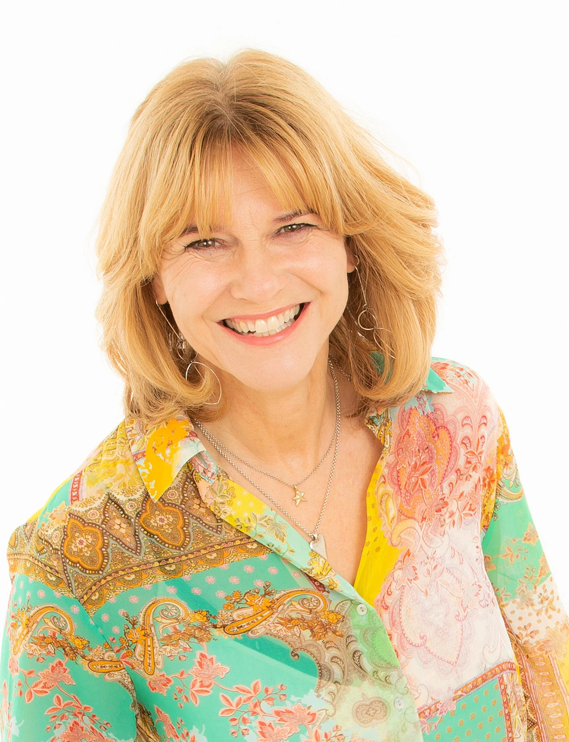 Smiling woman with shoulder-length reddish-blonde hair, wearing a colorful patchwork blouse and layered necklaces, against a white background.